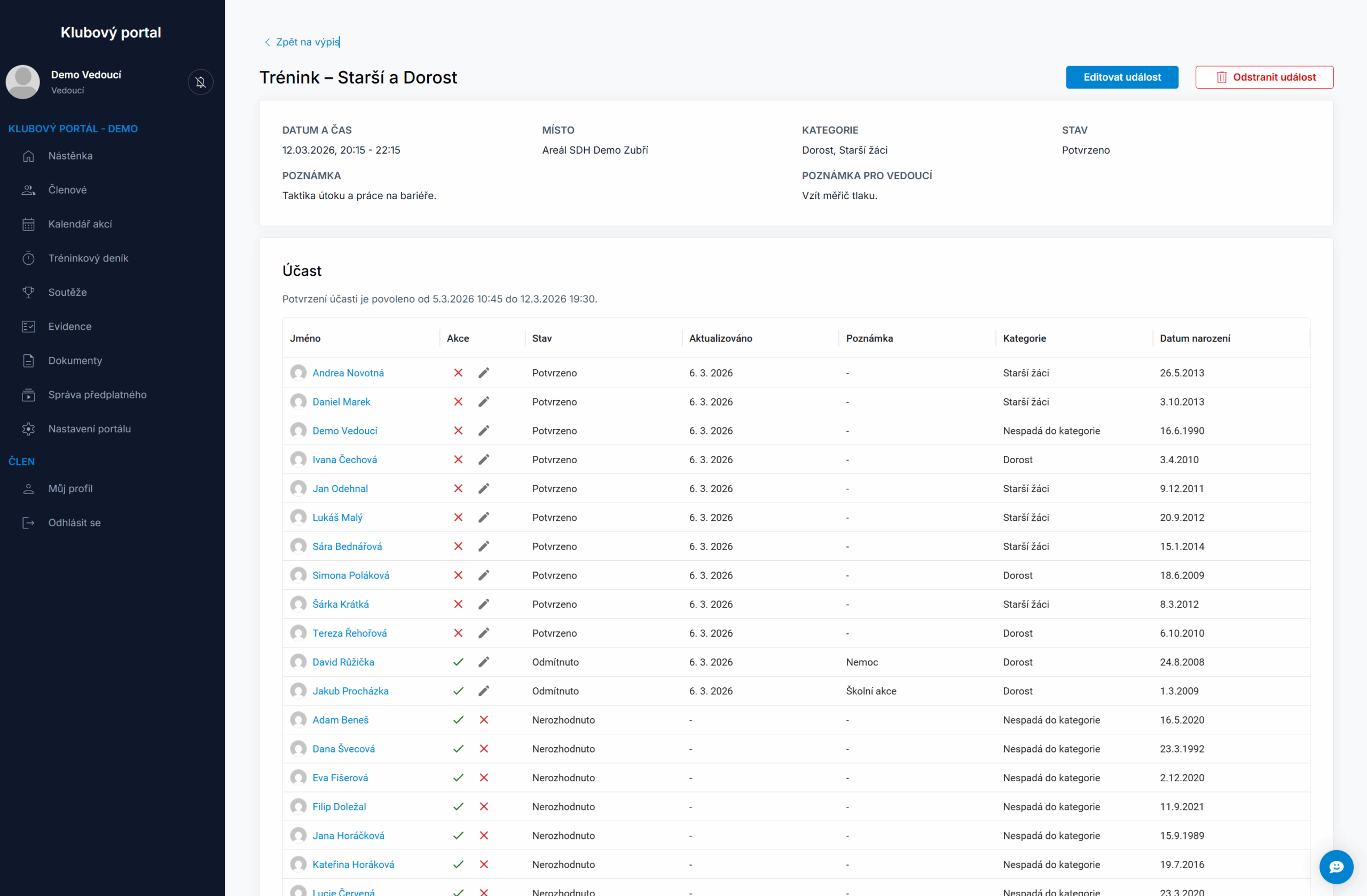 Vedoucí mají jasný přehled o tom kolik tréninků proběhlo, kdo se účastnil jednotlivých akcí nebo jak aktivní jsou jednotliví členové.
